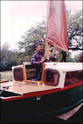 The Jewelbox prototype was built by Karl James of Winnsboro, Texas. Here's Karl raising the sail. You can see how safe the operation is. It's all done from inside the boat including stepping the mast.