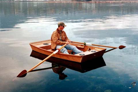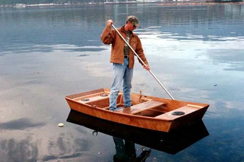 The eight foot version shown is ideal for one, suitable for two, and floats in about four inches of water. The wide flat bottom provides stability to stand, and the boat may be paddled, rowed, poled or motored, and the smallest of transom mounted motors will easily push the lightweight hull. It's an ideal first boat project.