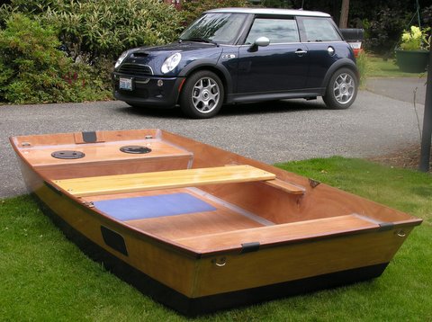 The eight foot version shown is ideal for one, suitable for two, and floats in about four inches of water. The wide flat bottom provides stability to stand, and the boat may be paddled, rowed, poled or motored, and the smallest of transom mounted motors will easily push the lightweight hull. It's an ideal first boat project.
