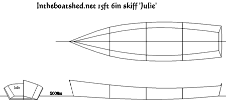 The Julie skiff as laid out in these plans is a lightweight stitch and glue flattie skiff that would be a nice rower for one and can carry two at a pinch. The name came from my partner, who took rather a shine to the boat.