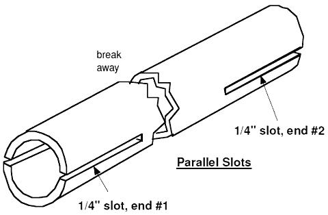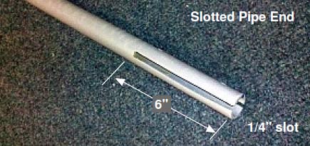 The paddle handle is made from the PVC Pipe. Cut a 6 foot length (7' depending on your application), and then cut a 1/4" slot, 6" long, on one end. I used a jigsaw with a long balde. Next, cut a similar slot on the other end, parallel to the first slot on end #1. See sketch lower left & photo previous page.