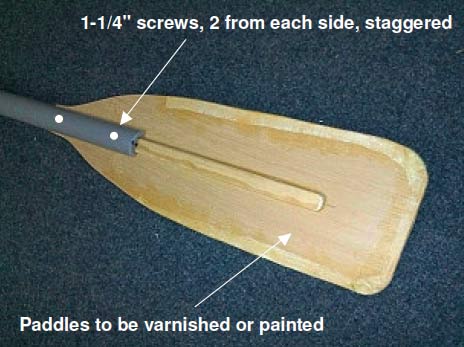 It would also be best if the paddles could float if misplaced (dropped overboard). The plastic tubing is heavier than water, but if filled with air they will float. So, cut 1 inch long dowel plugs (3) and glue them in place in the tubes, just aft of the paddles, and aft of the center connecting dowel opening. Use plenty of glue to hold in place. See photo above.