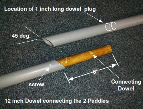 properly align both paddles during use. Now cut a 1 foot length of dowel and glue it 6 inches into the angled end of the 33 inch long handle. Small screws can be used to hold it in place. See photo below.