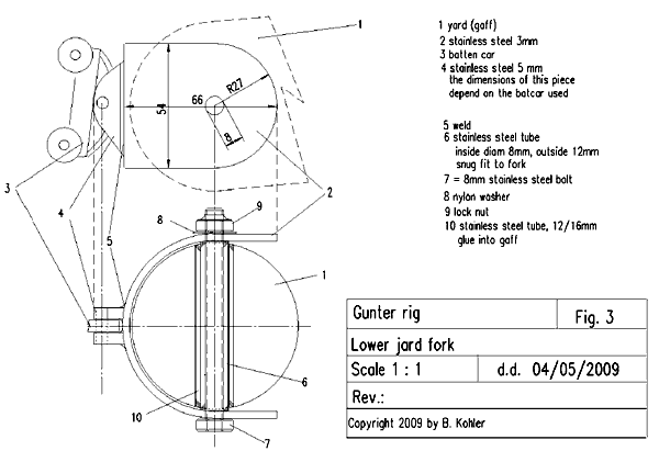 We have taken it a bit further and use a system in which the gaff slides complete up or down the mast, with a provision to unhook the gaff on the upper slider, so it can be turned back. This is necessary for sail setting and adding the battens. The gaff is set with one halyard only.