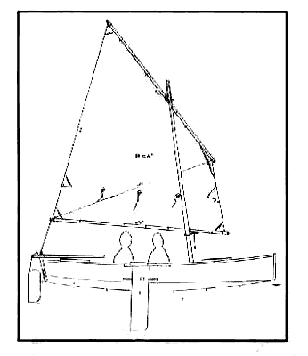 I've kept the same sail as with Woobo, a 75 square foot balanced lugsail. It hoists on a 13' mast with 11' yand and boom. All very low tech built with common materials.