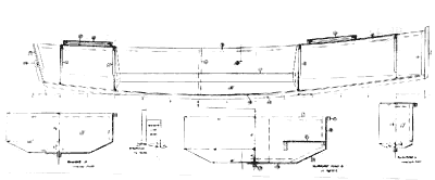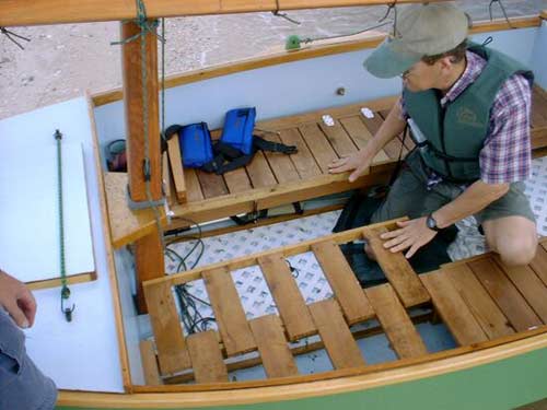 Ladybug's hull has the layout I like the best - a 6-1/2' cockpit between two storage/buoyancy boxes. It would be a great solo camping boat. The buoyant wooden spars prevent it from turning turtle. You bring it upright with weight on the lowered leeboard. Then you must climb back on board and a slot in the rudder seems to be the best boarding ladder around, bringing your weight back on board where it least affects the boat. You will have to bail some water.