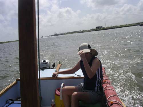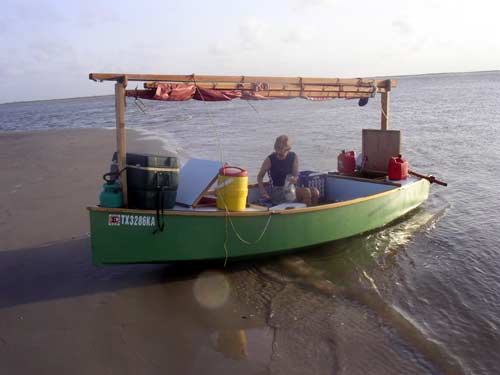Chuck Leinweber of Duckworksmagazine built the prototype and brought it to our Rend Lake messabout so I had a chance to go for a long ride in it. One thing that impressed me was how large it was for a 14' boat. In the opening photo you see it sail with three men on board, all comfortably sitting to windward on the bench seat, and I'm told it has sailed with four men with no effort. I do think it would be quite suitable for a family of four say with lots of room for all and storage space for all their junk. Here Sandra Leinweber sets things up at a recent campout on the Texas coast: