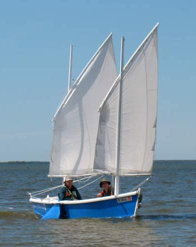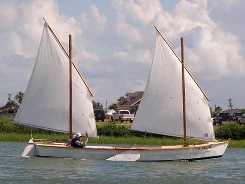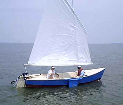 The prototype was quickly built by Gordo Barcom in Texas and here he is blasting along with family and polytarp sails straining. It was clearly a fast roomy boat: