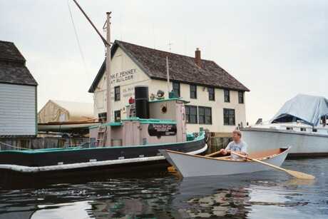 She rows extremely easily, better loaded than light because of the heavily rockered bottom. It cannot- be driven past hull speed even by a very strong person but is wonderful for eating up the miles at a moderate pace. I've covered 3 1/2 measured statute miles in an hour without busting my boiler and have travelled 25 miles in six hours with tidal assistance.