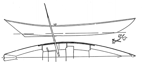 Like most fine ended boats she is pretty sensitive to trim, if I find she needs to be a little bow down to stop her blowing around broadside on while I try to row her to windward, or conversely, stern down for downwind I have a ten litre plastic container of water on a light line and toss it to the appropriate end of the boat The line is so I can retrieve it without moving from my secure seat amidships.