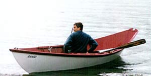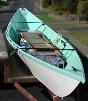 The light weight and the narrow waterline beam combine to make the boat feel a little tender when unloaded, especially when the rower is unused to the wiles of dories. I carry about 30 litres of water in plastic jerrycans which improves her stability and also helps the boat carry its way.