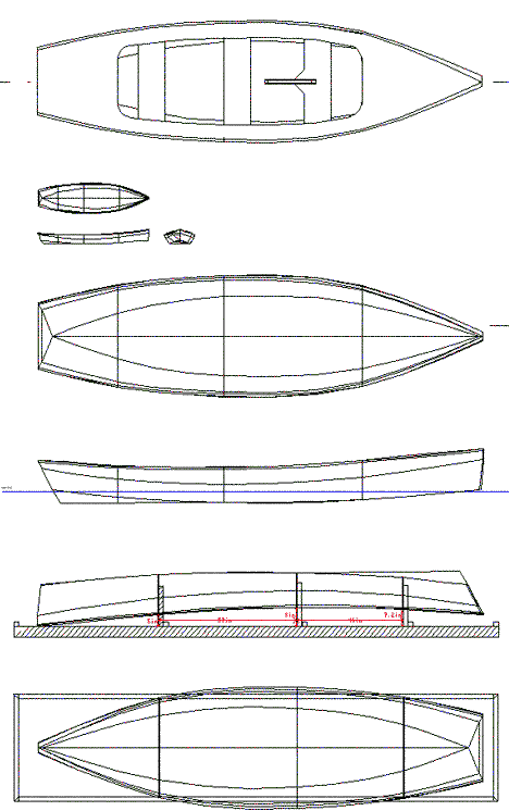 At least two versions are envisaged: an open rowing skiff, and a half-decked version for sailing, much like a sailing canoe. I'm also contemplating drawing up a smaller version for people with small areas for boat building, such as the typical British garage.