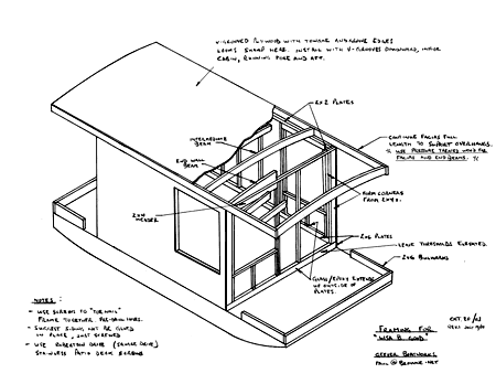 “Lisa B. Good” is the result of a discussion on the Yahoo Shantyboat Group. The design turned out to be an economy sized Shantyboat, about the minimum size that offers stand-up headroom, decent deck space, and long-weekend accommodations for a couple. I got thinking about the boat’s overall length today. I’d build her 16 foot as drawn. That length is handy, because you can easily get lumber that long. But there’s no reason why you couldn’t splice the longitudinals and facias to add a few feet to the middle of the boat, if you needed more room. Just keep the ends the same and take the extra length for the cabin or the decks as you want. Lisa B. is a very simple boat, and construction will be particularly straightforward; should be a quick build. There are only two curves on the boat, the bottom of the hull, and the crown in the cabin roof. The wood is all construction grade lumber and plywood. Use is made of epoxy and glass, but just enough to ensure long life without rot or excessive maintenance.
