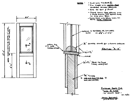 New custom doors are expensive. The plans show how to make doors that won’t get loose and come apart, without having all the machine tools normally used. The trick is to use a single piece of 3/4” plywood, cut out the window opening, and then apply trim pieces with finish nails and glue. A bit of filler around the edges, a little caulking, some sanding and paint, and you’re done.