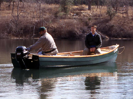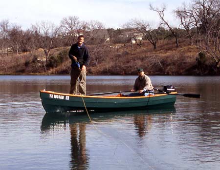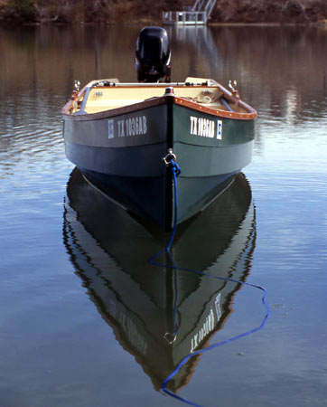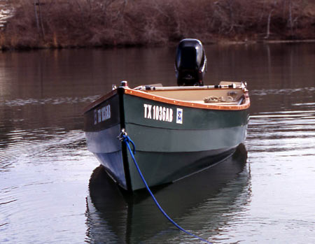 On her maiden voyage we took her to the Texas coast (Corpus Christi area) and she proved to be an excellent flats boat. Her very shallow draft (almost that of Flyfisher) and light weight, approximately 130 pounds without the motor, make her a dream to pole across the flats. Even in water less than 3" she rides on her skegs and I was able to slide Laker across mud and sand without having to step out of the boat.