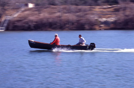 With two people, nearly 400 pounds in the photo, she draws approximately 3-1/2" to the bottom of her skegs. It takes 120 pounds to push her down an inch. Loaded as in the photo, a 9.9 four stroke pushes her at 18.5 mph (wide open throttle), as measured by a hand held GPS. If I re-proped her I could squeeze out 21 or 22 mph but I don't feel it is worth the expense. At 18.5 mph she is steady and true and at ¾ throttle I'm able to make hard over turns with Laker being very stable, no skipping, and no unexpected behavior (I have no reason to believe this wouldn't be true at WOT but I have not done that yet and probably will not, as this seems like poor seamanship).