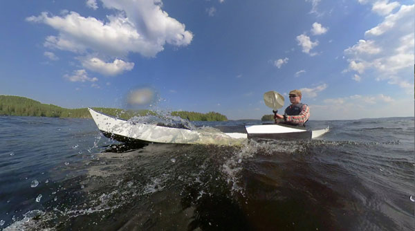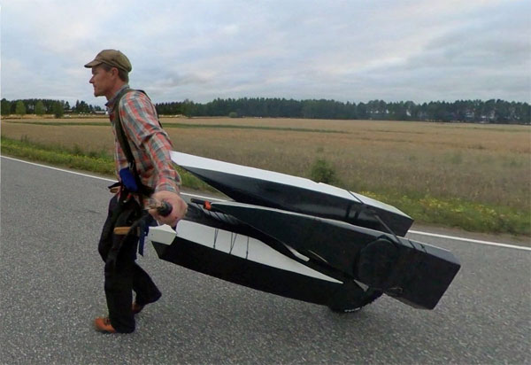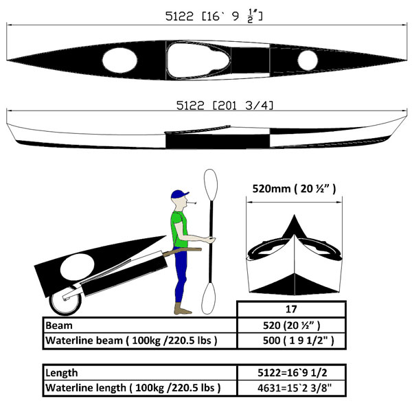Luonteri is a “trail hiking kayak”, that can be divided into three parts. It makes storage and transportation more easy. In addition, the kayak can be transported as a “cart” with one wheel along roads or trails. If your planning transitions along trails, I recommend packing lightly and using a stronger 20” fatbike wheel. While paddling, the wheel must be transported on the back deck. 12” Kids bike wheel fits inside boat, but it is not as good on trails.