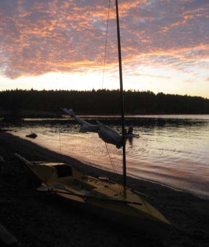 The Marsh Duck did everything I'd hoped for! Though intended as a solo cruiser, she accommodated 2 for the first 4 weeks. We slept aboard most nights, sometimes pulled up and leveled on the beach but more often at anchor, occasionally tied to a dock. We experienced the anxiety of long crossings in an untried boat, gained confidence and became more relaxed day by day, anchored in quiet coves for the night. We tied to docks and shared food, music and conversation with other cruisers in much larger boats. Dinners cooked on a one-burner propane stove were served on the side decks as we sat comfortably facing each other from either end of the cockpit. There were glorious sunsets, a canopy of brilliant stars. We enjoyed close encounters with seals, otters, porpoises, and myriad birds. A sea lion, as big as the boat, erupted from the water 20 feet away with a large salmon in his jaws.