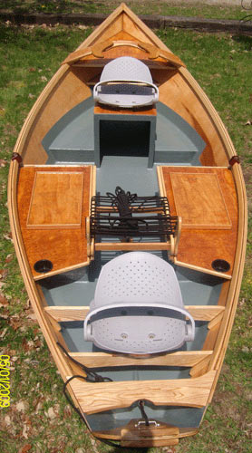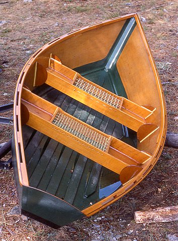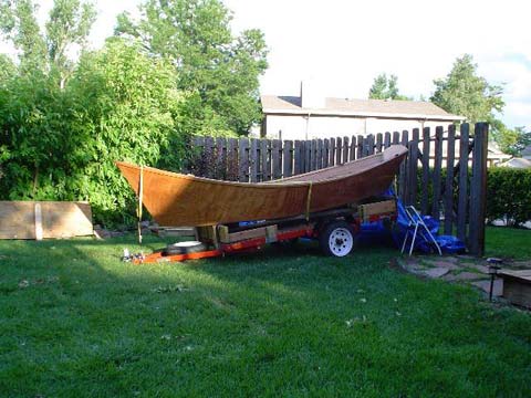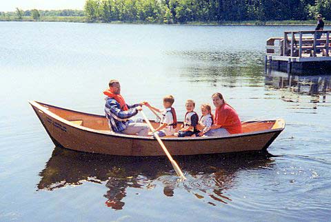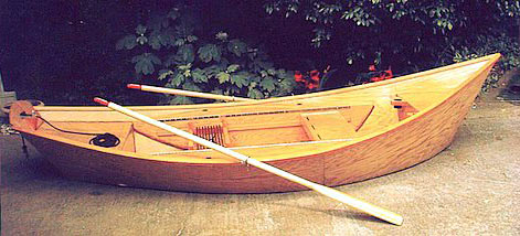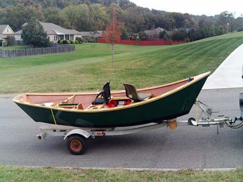 Hi Paul, it's been quite some time since I've spoken to you about building the Maxi boat but I finally got the boat done a few months ago. The plans were excellent and easy to follow. As promised here's the finished product. It took a little longer to build than I had expected (due to unforeseen mountain bicycle accident) but it sure was fun and very relaxing. The first day I launched it I caught fish and decided I need a little longer oars as you can probably tell from the photo. Now that I've had it in the water I may make a few modifications to the transom for addition of a little motor.