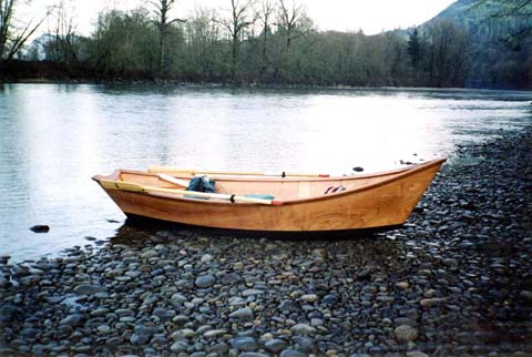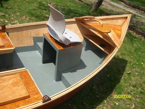 This version was built with lightweight the first priority. It has 4 mil BS1088 okoume ply topsides, all sealed with epoxy, and all trim wood is selected air-dried sitka spruce. Overall hull weight--before paint and varnish--was 98 pounds. After finishing, the boat weighed just over 100 pounds. Lightweight allows a larger payload, but the real advantage is realized getting the boat in and out of the water. In the water the hull can be ballasted, if necessary, to suit conditions. This boat was cartopped, and with the tough, slick, graphite bottom it can be dragged everywhere, over parking lots, launch ramps, and across gravel beaches, like a sled.