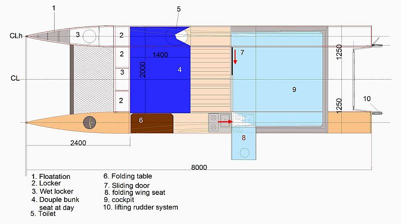 Here something different, have fun. My MaXi is a homage to the G32 from the Gougeon brothers. The hulls are, for easy of construction, Sharpie shaped, with some modifications at the bow. For best sailing performance the boat has centre/dagger boards. The rig has a boom system roll system to shorten the main sail. It is, as the mast, easy to build. For stability the boat has water ballast and a "wing seat" which is, in rest position a backrest in the cockpit. By sitting there the stability increase is bigger as with 200 L water ballast. The lifting device on the top of the mast helps to right the boat again. The inside of the cabin is comparable to my ECO 5.5.