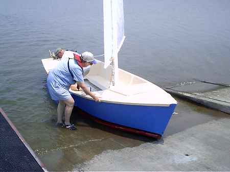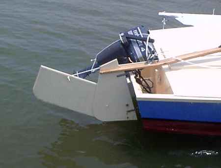 The motor well is an open self draining well that uses the full width and depth of the stern. It will come in handy for storing wet muddy things you don't want inside the boat, like boots and anchors. I've suggested in the plans that the rudder can be offset to one side a bit to give more room for the motor. We did not use George's little Evinrude since the boat sailed easily in all directions, but George says the side-by-side sharing on the stern of the motor and rudder works fine. There was no interference with the rudder. (As with any outboard on any sailboat, the motor has a desire to grab the sheet with each tack so you usually have to tend the sheet a bit.)