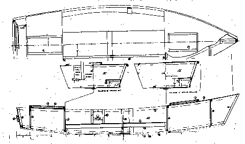 The balanced lug rig sets on short spars and sails very well reefed, in fact can be set up with jiffy reefing. The spars are all easily made and stowed, the mast being but 14' long setting 91 square feet of sail. In addition there are oar ports for those with lots of time and little money and a motor well for those with lots of money and no time. Two horsepower is all that a boat like this can absorb without going crazy.