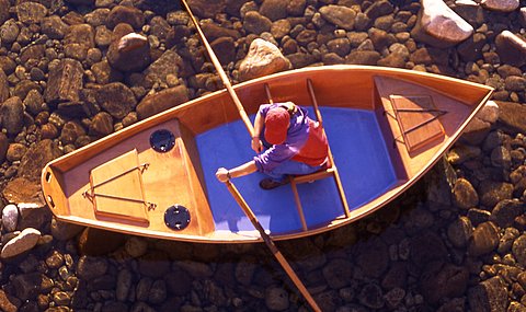 The Mini works best as a solo boat with space for extra gear but will handle two adults on flat water. Built as recommended the hull can weigh less than 90 pounds which makes it a cartopper if you don't want the hassle of a trailer, and it can also be hauled in the back of a pick-up truck. A lightweight boat allows increased payload, but the real advantage comes in getting the boat on and off the water and in and out of storage. The tough, slick graphite bottom also allows dragging the lightweight hull over parking lots, gravel and sand beaches and logs.