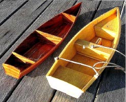 The photos of the rowboat model arrived the next morning! Peter whipped it up overnight and photographed it with the red timber glowing in the morning light. The white boat is the model of the Goat Island Skiff that Peter built years ago. Scale is approximately similar.