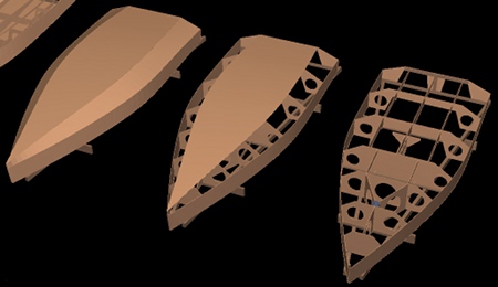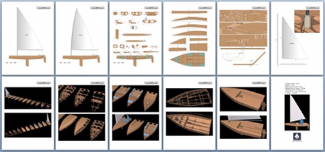 The plan details all the parts and hull panels, the parts nesting on plywood sheets, and a complete building sequence in 3D.