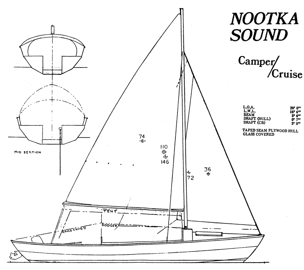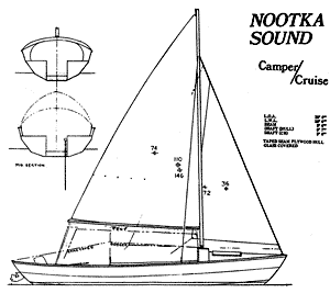 Nootka Sound is a Camping Cruiser. It was an original design for Bob Young of Lake Oswego, Oregon, but generally similar to several earlier designs. Among the requirements were: Light weight for good trailerability with normal family cars; shoal draft; good performance with sail, oars or a small outboard motor; and. good rough water performance. The main requirement, though, was cruising facilities for two people, somewhat better than backpacking, if not up to luxury yacht standards.