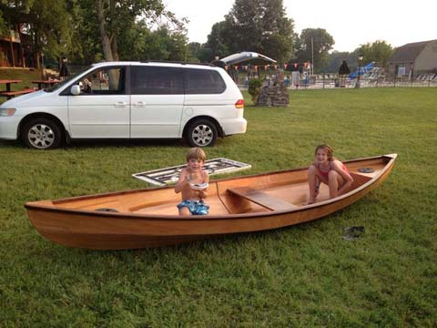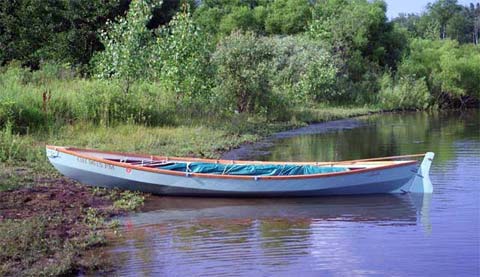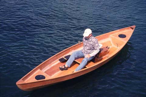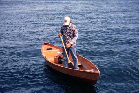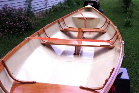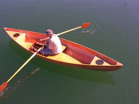 There is room for two rowing stations, or the double ender makes a pleasing solo camp cruiser with room for piles of gear. A drop-in sliding seat rowing unit such as the Piantedosi can be installed and removed in seconds, and the boat is fast enough to make an enjoyable exercise rower which works well in waves that would disable a rowing shell. With appropriate seating the boat may also be paddled like a canoe, or poled standing up in calm water. Build two of these and enjoy rowing or cruising together, or just drifting a quiet stream.