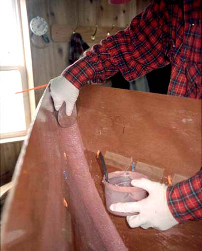 Construction is a straightforward process of stitching five full-length plywood panels together with plastic ties, then sealing seams with glass tape. No building base is required and bulkheads serve as forms to hold panels in alignment during assembly. To further streamline building, both ends of the gun dory are identical so the same plank pattern can be used 4 times. The hull interior is clean and open with none of the ribs, frames or stringers of traditional construction, making it easier to maintain, clean and repair. Hull reinforcement is provided by four full length chines, compartments, butt-blocks, seats and gunnel laminations. The hull exterior may be sheathed with glass cloth or glass tape can be laid over seams to save weight.