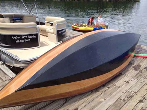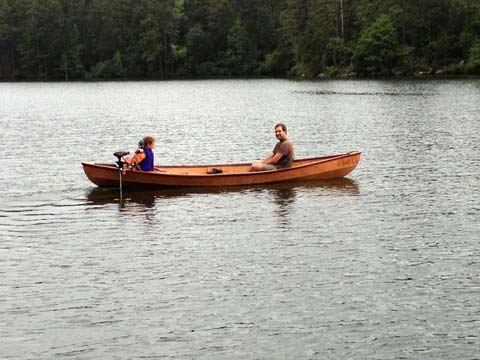 The smallest of electric or gas motors will push the slippery double chine hull, and a motor can be installed with a clamp-on side mount or in a custom built motor well conveniently located inside the boat. A typical motor well installation is included in the building plans.