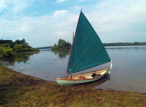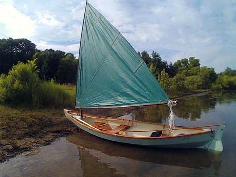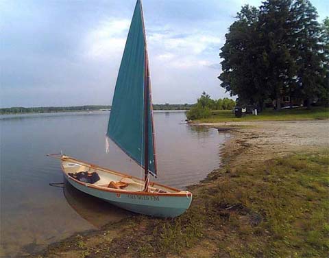 I wanted to share with you some pics of my completed Pacific Troller Dory. I just call it a gunning dory. Mine came out 15 foot 4 inches long, with a 4 foot beam. I added the sailing bits to the plan myself. The rig is a lateen sail and spars from an Old Town canoe that I picked up for $20. She rows and sails great. The boat is light enough that I can launch it from a dolly at my local beach. It will be used for fishing and sailing and rowing fun on Lake Erie. And she is light enough to be hauled cartop style on top of our popup camper when we go camping. I have yet to try the trolling motor on her, but I think she will do just fine with the little electric motor on there too. Maybe calls for some future tinkering.