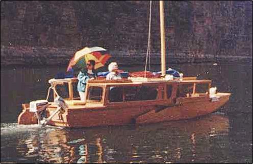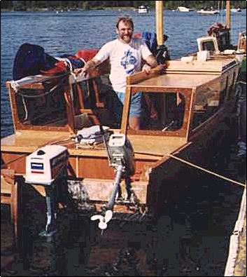 The sail rig is a 200 square foot balanced lug with a single pivoting leeboard. The rudder is offset to one side and the big motor is on centerline. We motor with the rudder retracted and sail with the motor retracted. Pete reports the effect of all the offsets in the rigging is nothing - she handles the same in both tacks. He says she always goes about 8.5 knots on the GPS reaching in a good wind.
