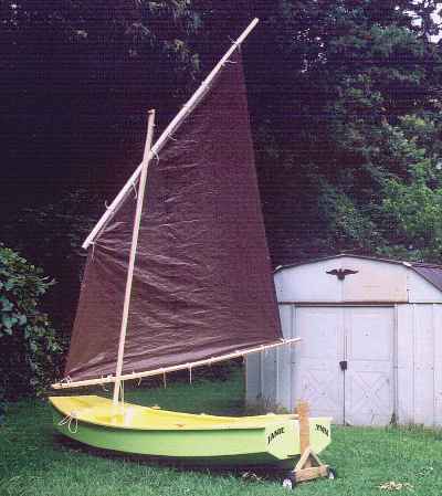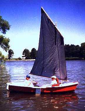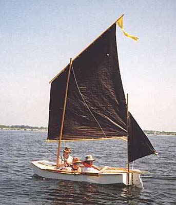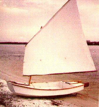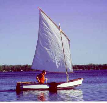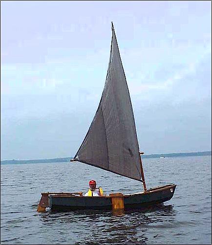 These boats have proven to be good for sail rig tinkerers (be sure to read and apply the Sail Area Math essay before starting). Here I am in Piccup with a polytarp sharpie sprit sail. The rig is different from the originals but the hull here is totally unchanged (except for paint) from the original shown on the beach at Pensacola.