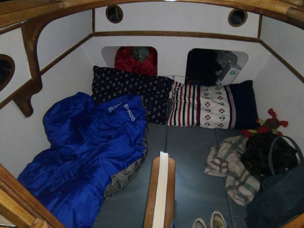 The boat has a large locker in the forepeak, where you can put all the camping stuff and stern section for mooring ropes, fenders and anchor. The cabin has 2 spacious berths 6' 4" long. Under the floorboards of the cabin is a removable ballast - sandbags.