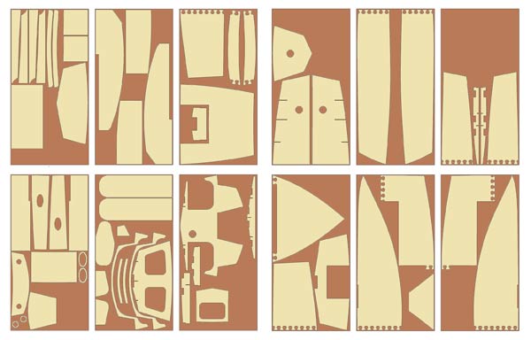 All parts of the hull are cut from 12 sheets of plywood (8x4'). The hull is built by the "sew and glue"
