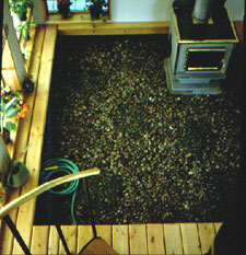 A wood stove was installed in a corner of the sunroom and a gravel floor which could be washed down with hose when muddy dogs or wet boots left tracks. Wire shelving was installed on the inside against the triple pane Low-E windows and was used to start plants.