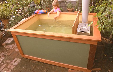 This simple tub can be built with a minimum of woodworking tools, and building materials are available from your local lumberyard. The tub can be built to any practical size and height, from a small single person configeration which uses a minimum amount of water and heats quickly, to a large family size tub. The tub is portable depending on size, it can be used indoors or out, and conventional heat and jetting systems can be installed as with any tub.