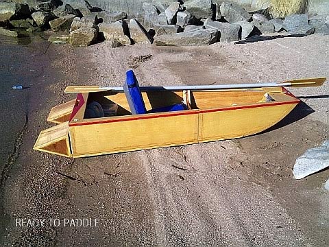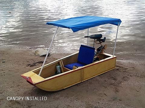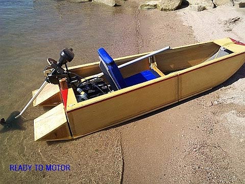 It was designed as a paddle boat, and as a trolling motor powered transportable. My guess is most builders will opt for the motor, as the hull shape is not ideal for efficient paddling, as compared to a canoe. But, I have designed and built a double paddle to be used with the boat, and the plans are offered free to those that need one. The cost to build the paddle should be about $15, using wood scraps from the boat build. After building and testing POKE ABOUT, I realized that a heavier occupant (I weigh 165) might require more buoyancy in the aft end, if they were to use the motor and battery option. So, I designed removable buoyancy cells to be placed on the transom for just such an occasion. These have proven to not only benefit flotation, but also add about 1/2 mph to the hull speed, due to the lengthened waterline. I have recorded 3.5 mph maximum speed with a 36 pound thrust trolling motor. Not bad for such a small boat. Building cost of POKE ABOUT is under $100, with an additional $60 for finishing and painting, including the cells.