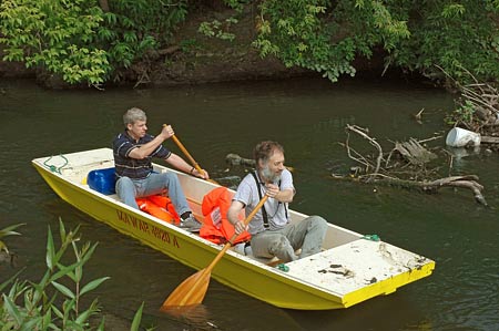 "Here is a brief description of polepunt nautical characteristics. The first is that polepunt is incredibly stable. During our cruise the crew (Wojtek Baginski is in the stern in most of these photos and his boating buddy Wojtek Holnicki in the bow) was often forced to gather on the stern first, and next on the bow (after boat's center has passed over the bar) to jump over a tree or a branch laying in the water, not stopping the punt. We were using the internal stiffener as a walkway and it helped much to keep the balance.