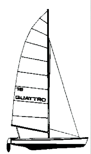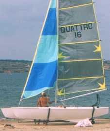 The QUATTRO 16 is a twin trapeze high performance racing cat that has proven faster than the Hobie 16 or Dart 18. The hulls are rounded V built using the "stitch and glue" plywood technique which results in stiff, light-weight hulls (two adults can carry a fully rigged Quattro up the beach). Small skegs help tacking and pointing and protect the hull bottoms when beaching. A forward beam is used to stiffen the forestay. Like the PIXIE, the QUATTRO 16 is sold by the prestigious Wooden Boat magazine, the only catamaran plans in their portfolio.