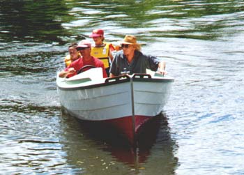 To obtain this performance with the modified dory hull form I used for Rifleman a 20 hp motor should be adequate for those cruising two up, while a "25" should be quick enough for most even when loaded up a bit. At the gentler end of the scale an 8hp motor should push her along nicely, and a 15hp plane her comfortably with two aboard. One has been fitted with a four stroke Honda 15 and is a particularly smooth and quiet boat in use (and no oily rainbow sheen on the water!)