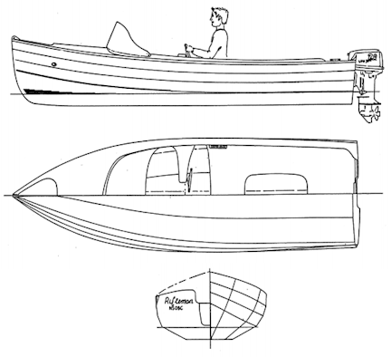 My client described himself as "not as young as he once was" and arthritis means he cannot tolerate a cold, cramped seating position for long. His boat needed to be faster than Rogue could be pushed with an outboard, her shape being wrong for planing speeds with a bigger outboard motor. But the advantages of the unusually light weight with the consequent ease of handling was to be retained, along with the practical interior, ease of building and not least the lapstrake or "clinker" sides. So, starting with a blank sheet of paper I started drawing up Rifleman, an outboard motor powered planing hull with a designed serviced speed under normal conditions of 18 - 20 knots. This should mean a top speed in flat water of about 25 knots, not super boat performance but a comfortable cruising speed for a fisherman who doesn't have to cover a huge mileage to his pet spot.