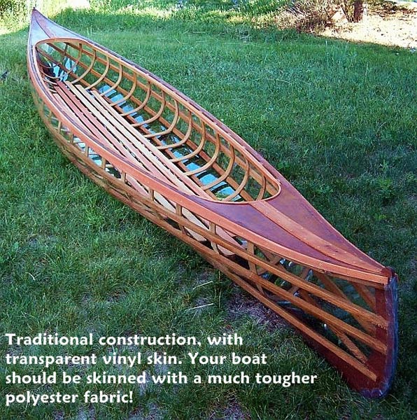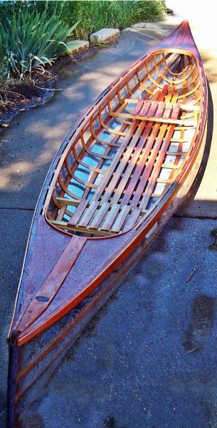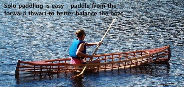The IGO is easier and faster to paddle than many modern canoes, but the trade-off is that she has somewhat less stability and carrying capacity. An IGO is ideal for messing about on ponds, marshes, lakes and slow moving rivers, and is great as a day paddler or solo expedition boat. She tracks well, turns easily, and can readily be handled by either one or two paddlers - with room for gear, kids or pets! At only about 40 lbs {18kg}, this skin-on-frame version of Rushton's IGO is very easy to carry and cartop.