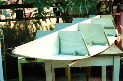 It requires no strongback (building support) as the hull is self jigging. The hull has a minimised internal structure, the seat is a block of foam set into the deck, carved to hold you in place and then glassed over. My calculations show the weight will come in at 11.5kg (25lb) built of Gaboon ply and epoxy - comparable with production skis.