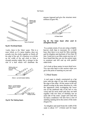 A large part of the manual is still dedicated to making your own suit of sails - rather than being a mystery, the construction of a sail is broken down into it's different structural parts in much the same way as the hull structure of a boat with 76 clear diagrams showing the construction techniques used to make up the components of the sail. The chapters include a detailed look at the different stitches and seam constructions used, finishing techniques, step by step guides to the making of both Bermudan and Gaff/Gunter/Lug sails and Headsails. Also included is a section on the re-cutting of old sails and on fault finding. The whole manual will give the owner who already has a suit of sails, a better understanding of how his sails work and what may be wrong if he has a problem with them.