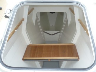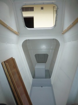 A: The boat has a cabin for 2 persons. The 2 persons can be sitted in front of the other one at the center of the boat. There is 1,30m of headroom, with 80cm wide. We can go inside even if the boat is sailing.